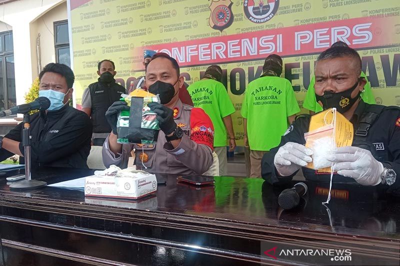 Police officers in Lhokseumawe City, Aceh Province, thwarted four drug traffickers' attempts to trade 2.2 kg of crystal methamphetamine or sabu-sabu,and apprehended three of the four suspects. ANTARA/Dedy Syahputra