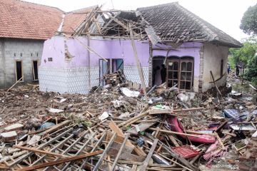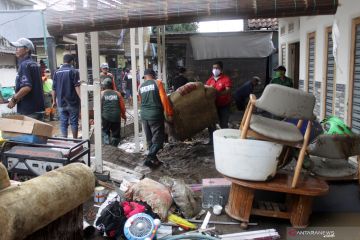 Warga bersihkan material lumpur pasca banjir bandang landa Kampung Guha Mulya, Bandung Barat