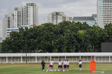 Some Indonesian female soccer players from the national team conduct exercises in the training center in the Gelora Bung Karno Madya Stadium in Jakarta, Friday (January 7, 2022). The training center is carried out as preparation for the 2022 AFC Women’s Asian Cup in Pune and Mumbai, India, from January 20 to February 6, 2022. ANTARA FOTO/Galih Pradipta/wsj/ac/ak.