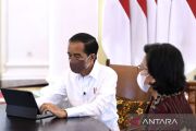 President Joko Widodo, accompanied by Finance Minister Sri Mulyani, fills an online form of annual tax return (SPT) at the Presidential Palace in Bogor, West Java on Friday (March 4, 2022). The president calls on all taxpayers to fill the form no later than March 31, 2022. ANTARA FOTO/BPMI Setpres-Kris/rwa/jtr/as.