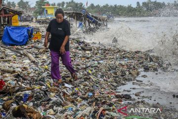 Sampah terdampar akibat gelombang tinggi di perairan Banten
