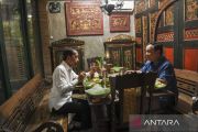 Presiden Prabowo Subianto (right) talks with the 7th Indonesian President Joko Widodo (left) in the middle of dinner in Solo, Central Java, Sunday (November 3, 2024). The meeting lasts about one hour. ANTARA FOTO/Galih Pradipta/tom/Y012