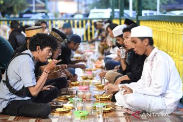 Muslims eat Bubur Peca, a traditional rice porridge from Samarinda, to break their fast at Shiratal Mustaqiem Mosque in Samarinda Seberang, Samarinda, East Kalimantan, Indonesia, Saturday (Feb. 21, 2026). Mosque officials distribute at least 300 portions daily during Ramadan to preserve the traditional dish of Kampung Masjid, a nationally recognized intangible cultural heritage passed down for around 100 years. ANTARA FOTO/M Risyal Hidayat/YU/M052