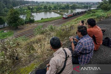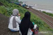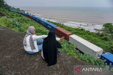 Residents sit on the edge of Bukit Cinta cliff at Jodo Beach, Gringsing, Batang district, Central Java, watching a train pass by on Tuesday (Feb. 24, 2026). Despite the risks, locals access the cliff to enjoy the sunset, the expanse of the northern Java Sea, and passing trains while waiting to break their fast during Ramadan 2026, crossing railway tracks under supervision by Indonesian Railways Company (PT KAI) staff. ANTARA FOTO/Harviyan Perdana Putra/foc/M052
