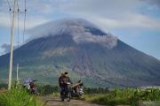 A motorcyclist rides past volcanic smoke rising from Mount Semeru’s crater as seen from Supiturang Village, Lumajang, East Java, Wednesday (Feb. 25, 2026). The Center for Volcanology and Geological Hazard Mitigation (PVMBG) reports that the eruption produces an ash column 400-600 meters above the summit, and residents are urged to remain alert to potential lava flow flooding due to ongoing heavy rainfall. ANTARA FOTO/Irfan Sumanjaya/foc/M052