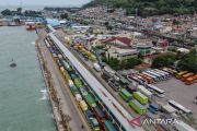 An aerial view shows trucks queuing to load and unload at Merak Port, Cilegon, Banten, Wednesday (March 4, 2026). The long line of cargo vehicles extends beyond the port area due to rising traffic to Sumatra and delays in loading operations caused by bad weather and strong winds in the Sunda Strait. ANTARA FOTO/Muhammad Bagus Khoirunas/tom/M052