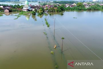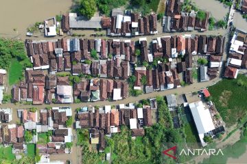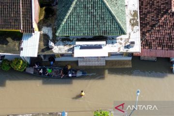 Aerial view shows a resident walking along a flooded street in Beji, Pasuruan, East Java, Wednesday (March 25, 2026). Heavy rainfall over recent days triggers flooding, submerging hundreds of homes. ANTARA FOTO/Umarul Faruq/tom/M052