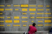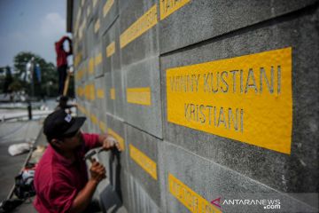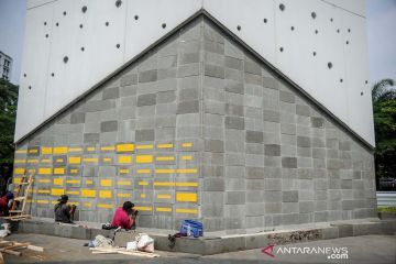 A worker sculpts the names of health workers who died from COVID-19 at the Gasibu Monument, Bandung, West Java, October 4, 2021. The West Java provincial government asked the central government to make the Gasibu Monument a monument to commemorate the struggle of COVID-19 heroes. ANTARA FOTO/Raisan Al Farisi/aww/bp/as